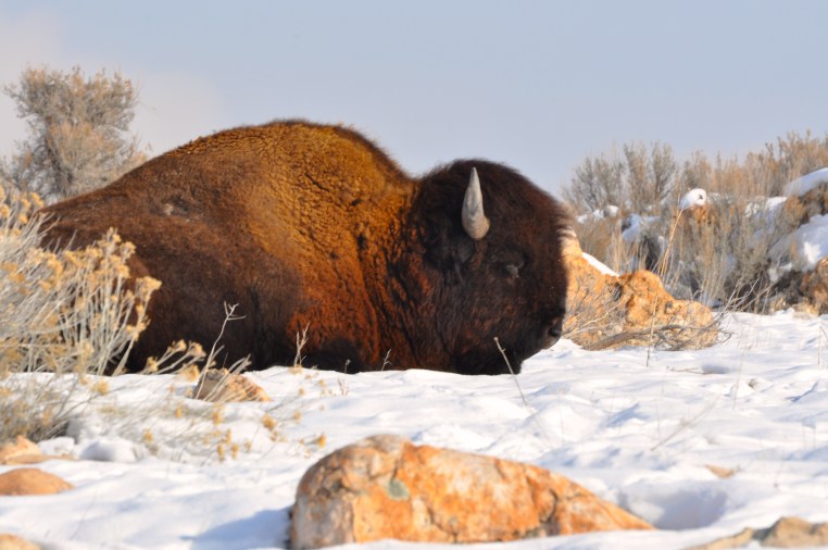 One of the many buffalo lays atop a blanket of snow.